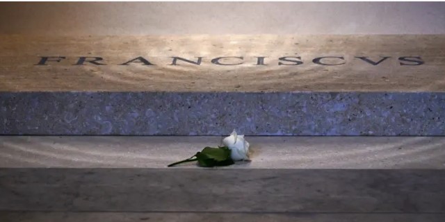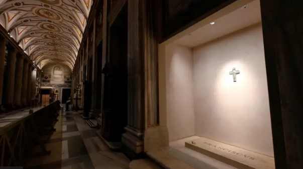 تظهر الصور الأولى لقبر البابا فرنسيس في كنيسة سانتا ماريا ماجوري في روما بساطة القبر الذي صممه البابا الراحل كمكان راحة أبدي له، حيث فوق الاسم الذي كان معروفًا به أثناء حبريته، يتدلى صليب فضي مضاء بكشاف ضوء واحد.