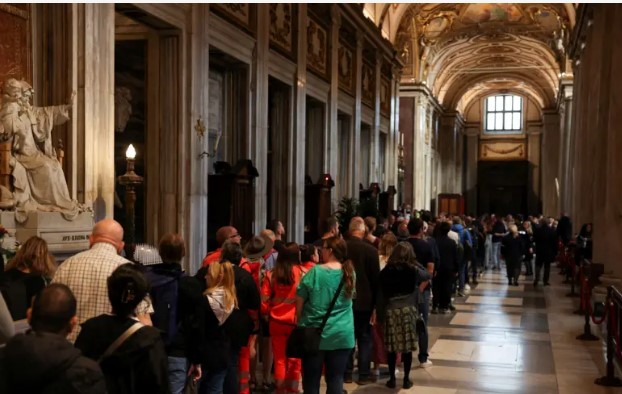 واصطف مئات الأشخاص أمس الأحد ليكونوا أول من يقدم احترامهم للبابا فرانسيس، الذي توفي في 21 أبريل عن عمر يناهز 88 عامًا، ومن بينهم روزاريو كوريالي، وهي إيطالية، والتي قالت إن رؤية القبر كانت "مؤثرة للغاية"، مضيفة "لقد ترك بصمة لا تمحى علينا".