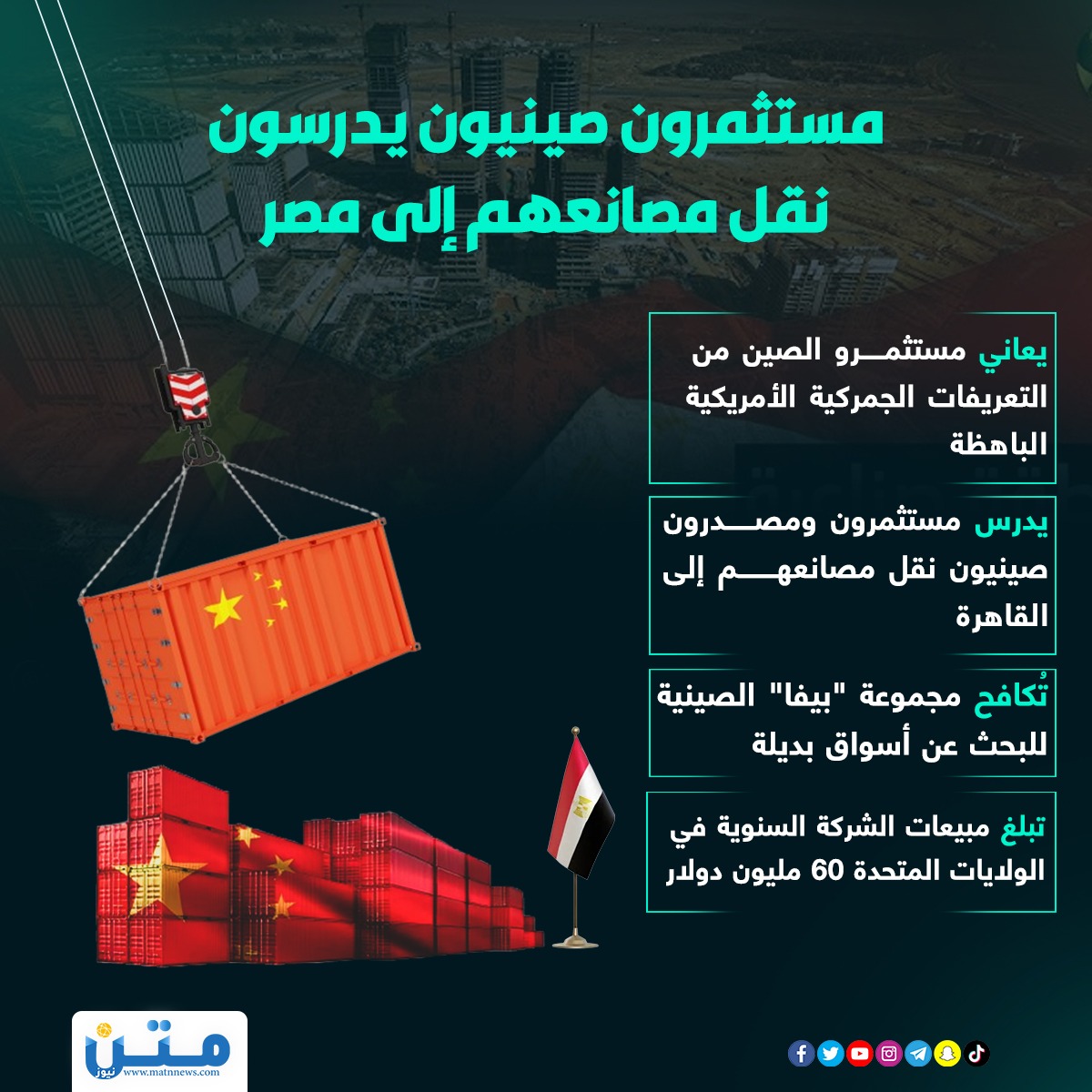 مستثمرون صينيون يدرسون نقل مصانعهم إلى مصر (إنفوجراف)