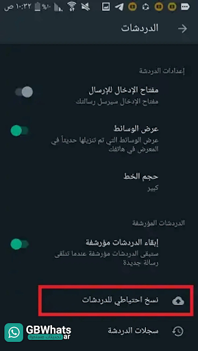 حيث عليك التوجه في البداية إلى النسخة العادية من واتساب، ومن ثم تقوم بنسخ احتياطي للدردشات ومحادثاتك فيها عن طريق التوجه إلى الإعدادات ومن ثم الدردشة وفي الأسفل ستجد "نسخ احتياطي"، وهذه الخطوة مهمة، كي لا تفقد محادثاتك، وفقط اختر حساب جوجل درايف ليتم حفظ النسخ به ففي البداية ستتوجه إلى واتساب العادي ومن ثم الإعدادات ثم "الدردشات" كما في الصورة الموضحة أسفله: