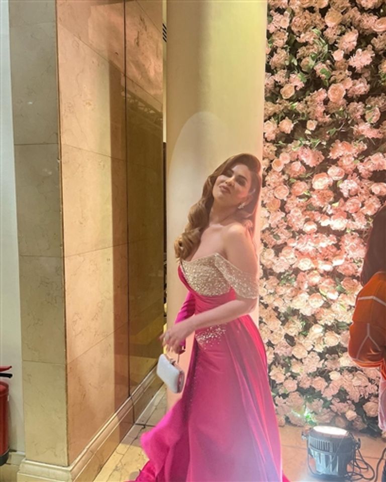 مي سليم ارتدت فستانا باللون "الفوشيا"، مكشوف الكتفين، بكم واحد طويل، مطرز من منطقة الصدر، وأشعلت حفل الزفاف بالرقصة الشهيرة.