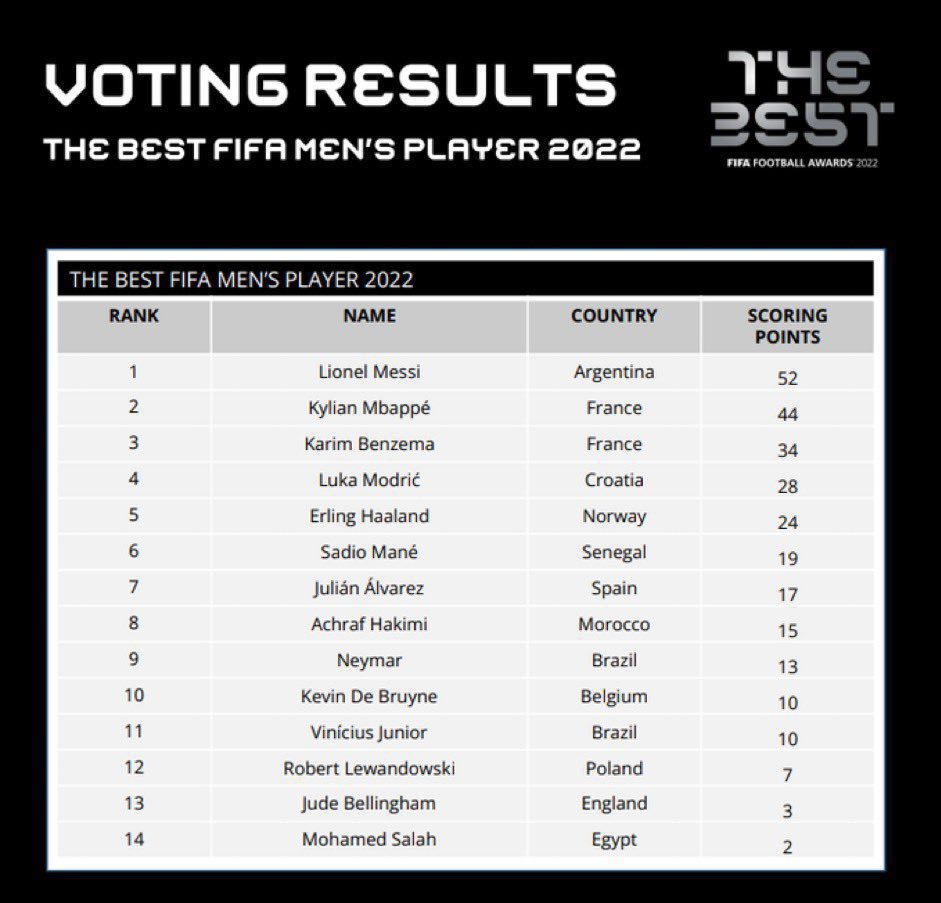 وحصل ميسي على أعلى نقاط وفقا للقائمة التي كشف عنها الفيفا برصيد 52 نقطة، متفوقا على النجم الفرنسي كيليان مبابي نجم باريس سان جيرمان الذي حصد 44 نقطة، فيما حصل مواطنه كريم بنزيما نجم ريال مدريد على المركز الثالث برصيد 34 نقطة.