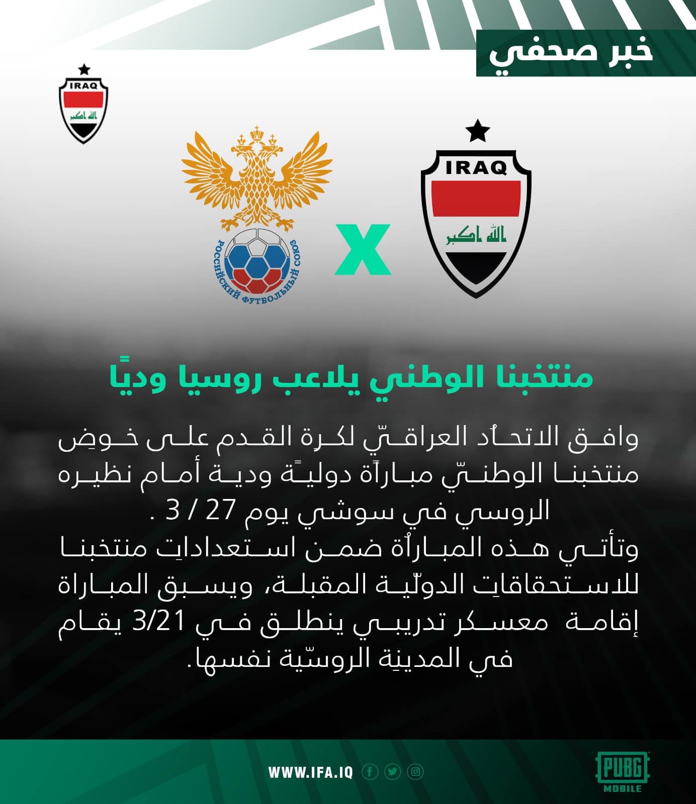 أعلن الاتحاد العراقي لكرة القدم، عن خوض منتخب العراق الأول مباراة ودية أمام منتخب روسيا، ضمن تحضيراته للاستحقاقات الدولية المقبلة.