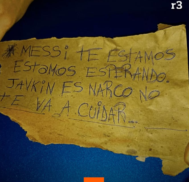 وذكرت الصحيفة أن المهاجمين تركوا رسالة مكتوبة بخط اليد في مكان الحادث تقول: "ميسي، نحن في انتظارك، جافكين مهرب مخدرات، ولن يحميك".