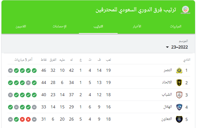 بعد مبارة النصر ضد الباطن.. ما هو ترتيب الدوري السعودي للمحترفين 2022_2023؟