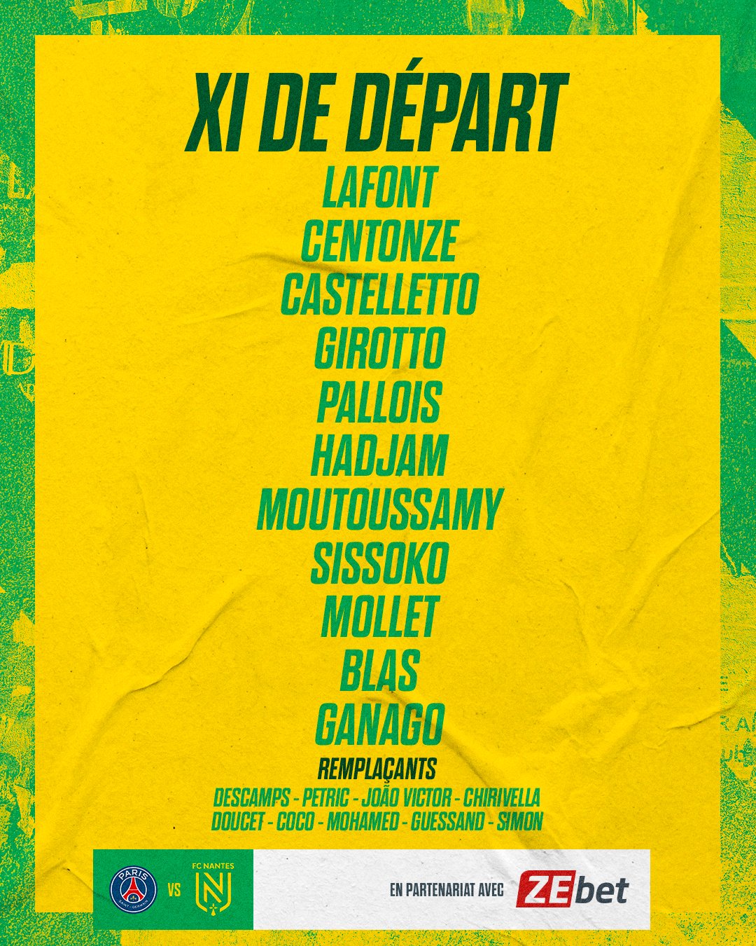في حين، جاء تشكيل باريس سان جيرمان لمباراة نانت، والذي أعلنه كريستوف جالتيير، المدير الفني للفريق البارسي، كالتالي: