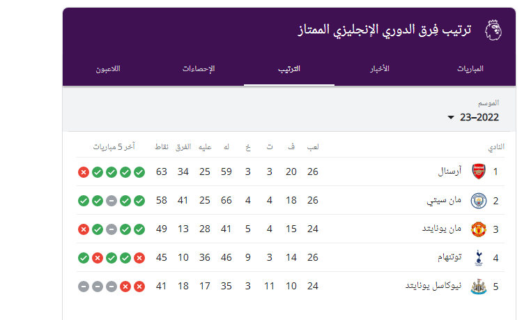 فوز آرسنال على نظيره بورنموث بثلاثة أهداف مقابل هدفين، رفع رصيده إلى 63 نقطة في صدارة ترتيب الدوري الإنجليزي الممتاز، وحافظ على فارق الـ 5 نقاط مع مانشستر سيتي، الذي نجح هو الآخر في التفوق على نيوكاسل يونايتد بثنائية بيضاء.