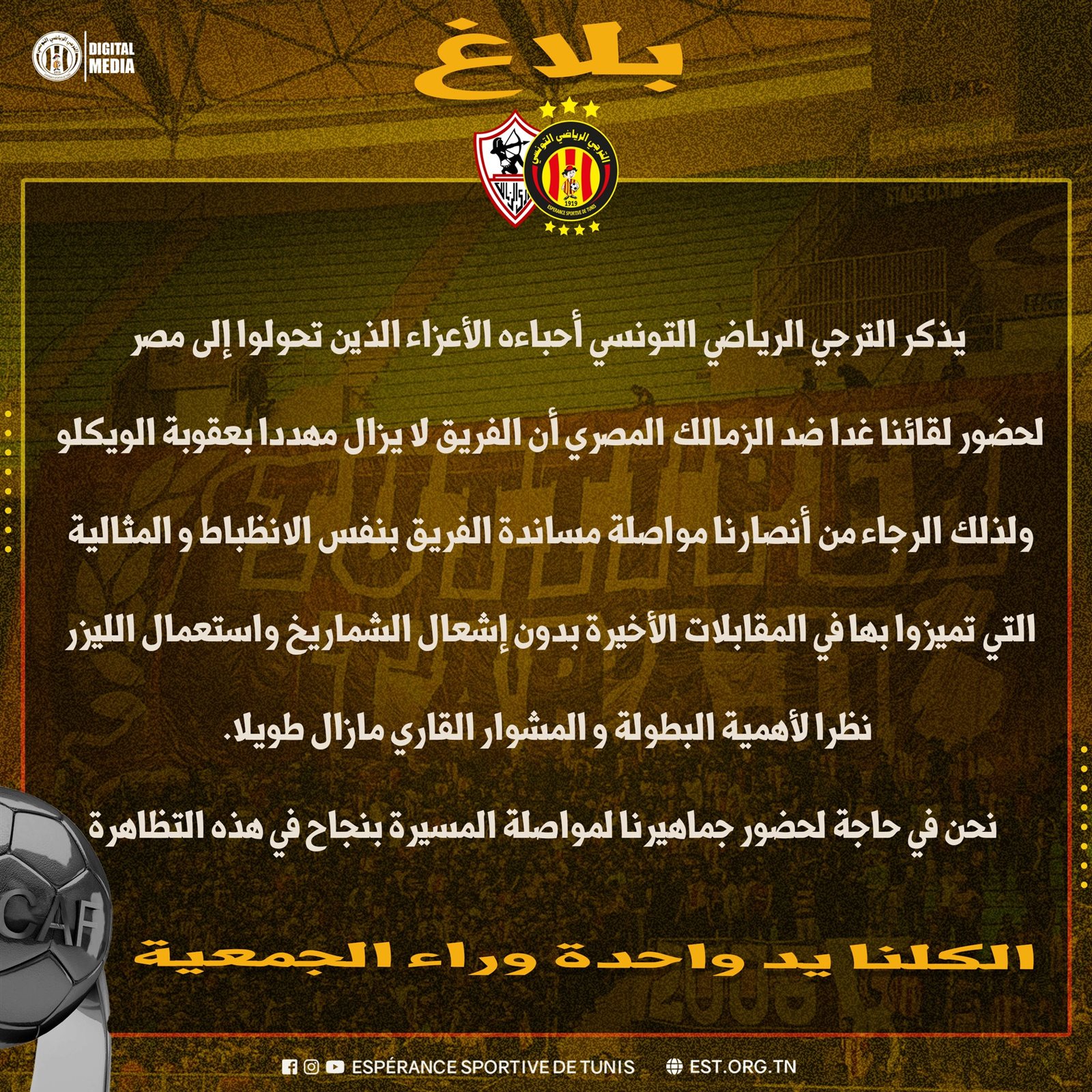 يذكّر الترجي الرياضي التونسي أحباءه الأعزاء الذين تحولوا إلى مصر لحضور لقائنا غدا ضد الزمالك المصري أن الفريق لا يزال مهددا بعقوبة الوكيل.