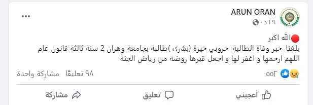 وأعلنت جامعة وهران خلال الساعات القليلة الماضية، عن وجود جثة اللاعبة في أحد الشواطئ، ونعيها عبر صفحة الجامعة الرسمية على موقع التواصل الاجتماعي "فيسبوك".