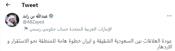 حيث قال الشيخ عبدالله بن زايد آل نهيان في تغريدة عبر حسابه الرسمي بموقع تويتر، إن عودة العلاقات بين السعودية وإيران تشكل خطوة هامة للمنطقة نحو الاستقرار والازدهار".