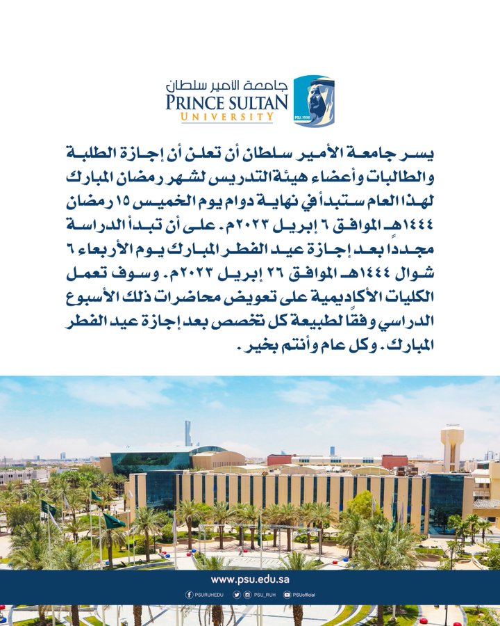 إعلان مهم من قبل جامعة الأمير سلطان حول موعد إجازة الطلبة والطالبات وأعضاء هيئة التدريس في رمضان 2023