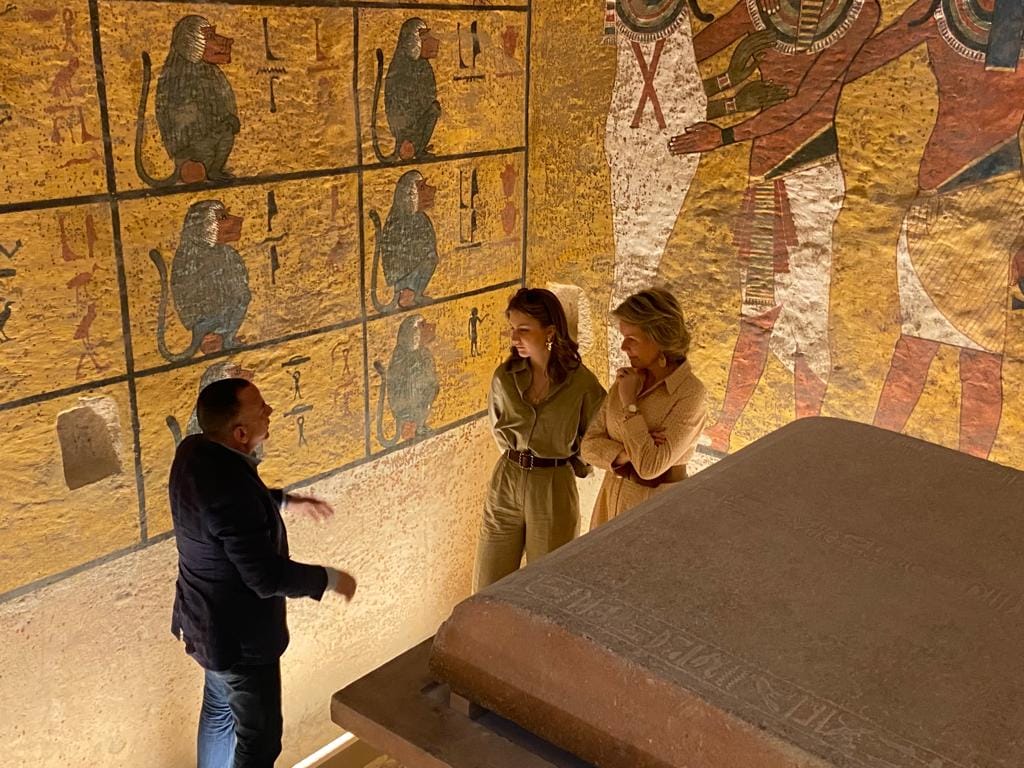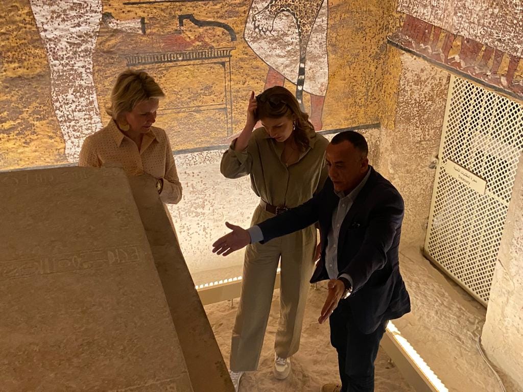 وأوضح الدكتور مصطفى وزيري أن الزيارة شملت أماكن عمل البعثات البلجيكية في الكاب ودير المدينة ومقابر الأشراف، بالإضافة إلى مقبرة الملك توت عنخ آمون بوادي الملوك، حيث قام الدكتور مصطفى وزيري بشرح تاريخ المقبرة وقصة اكتشافها على يد عالم الاثار هيوارد كارتر عام 1923 والتي شاركت الملكة إليزابيث في الإفتتاح الرسمي لها.