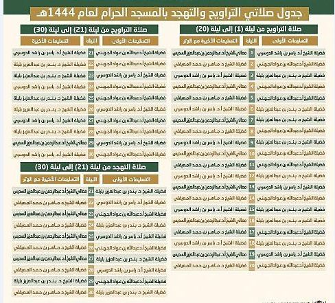 كما أعلنت أنه فى الليلة الثانية يكون الشيخ الدكتور عبدالله بن عواد الجهني، وفى التسليمتين الأخيرتين مع الوتر الشيخ الدكتور ماهر المعيقلي، والليلة الثالثة فى التسليمات الأولى الشيخ الدكتور بندر بن عبدالعزيز بليلة، وفى التسليمتين الأخيرتين مع الوتر الشيخ الدكتور ياسر بن راشد الدوسري. وفق بيان لرئاسة الحرمين.