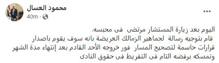 وكتب العسال في منشور عبر حسابه الرسمي على موقع التواصل "فيسبوك": "اليوم بعد زيارة المستشار مرتضى في محبسه، قام بتوجيه رسالة لجماهير الزمالك العريضة".