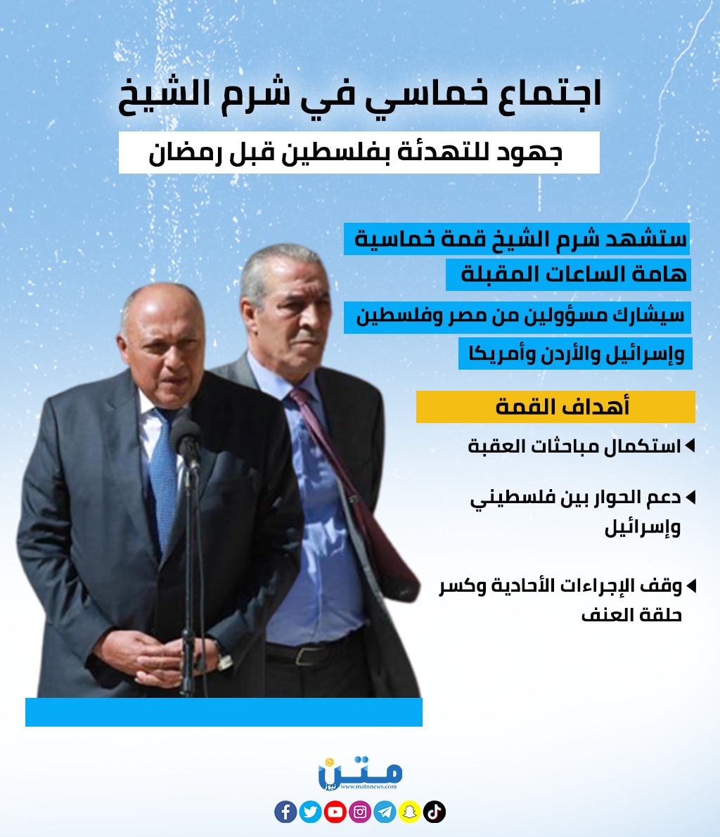 اجتماع خماسي في شرم الشيخ.. جهود للتهدئة بفلسطين قبل رمضان (انفوجراف)