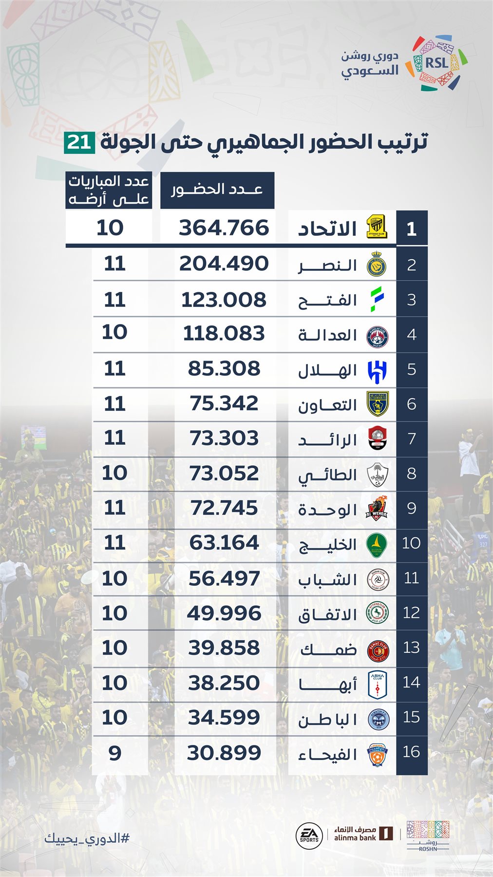 وتصدر فريق الاتحاد قائمة الحضور جماهيري بنحو 365 ألف مشجع خلال 10 مباريات، فيما حل النصر ثانيًا بما يقارب 205 آلاف مشجع خلال 11 مباراة.