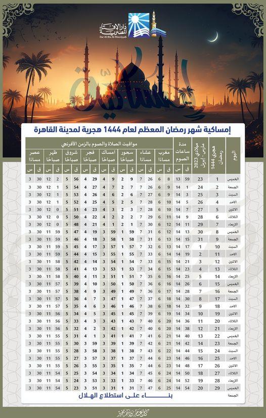 نشرت دار الإفتاء المصرية إمساكية شهر رمضان الكريم لعام 2023.