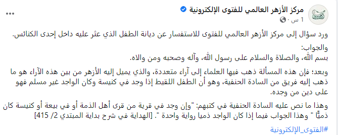 ورد إلى مركز الأزهر العالمي للفتوى الإلكترونية، سؤالًا من أحد الأشخاص، جاء في نصه: ما ديانة الطفل الذي عثر عليه داخل إحدى الكنائس؟