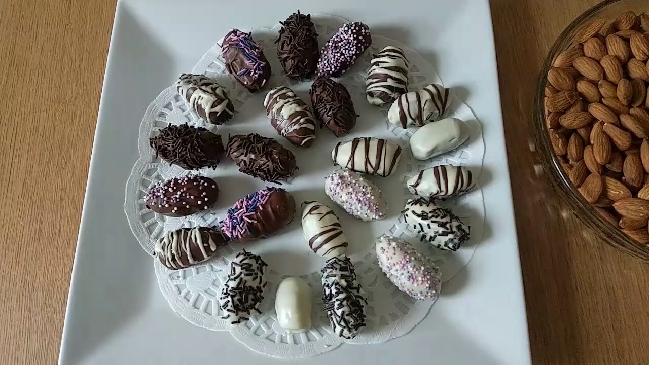 - غلفي كل كرة من كرات التمر بالشوكولاتة المذابة.