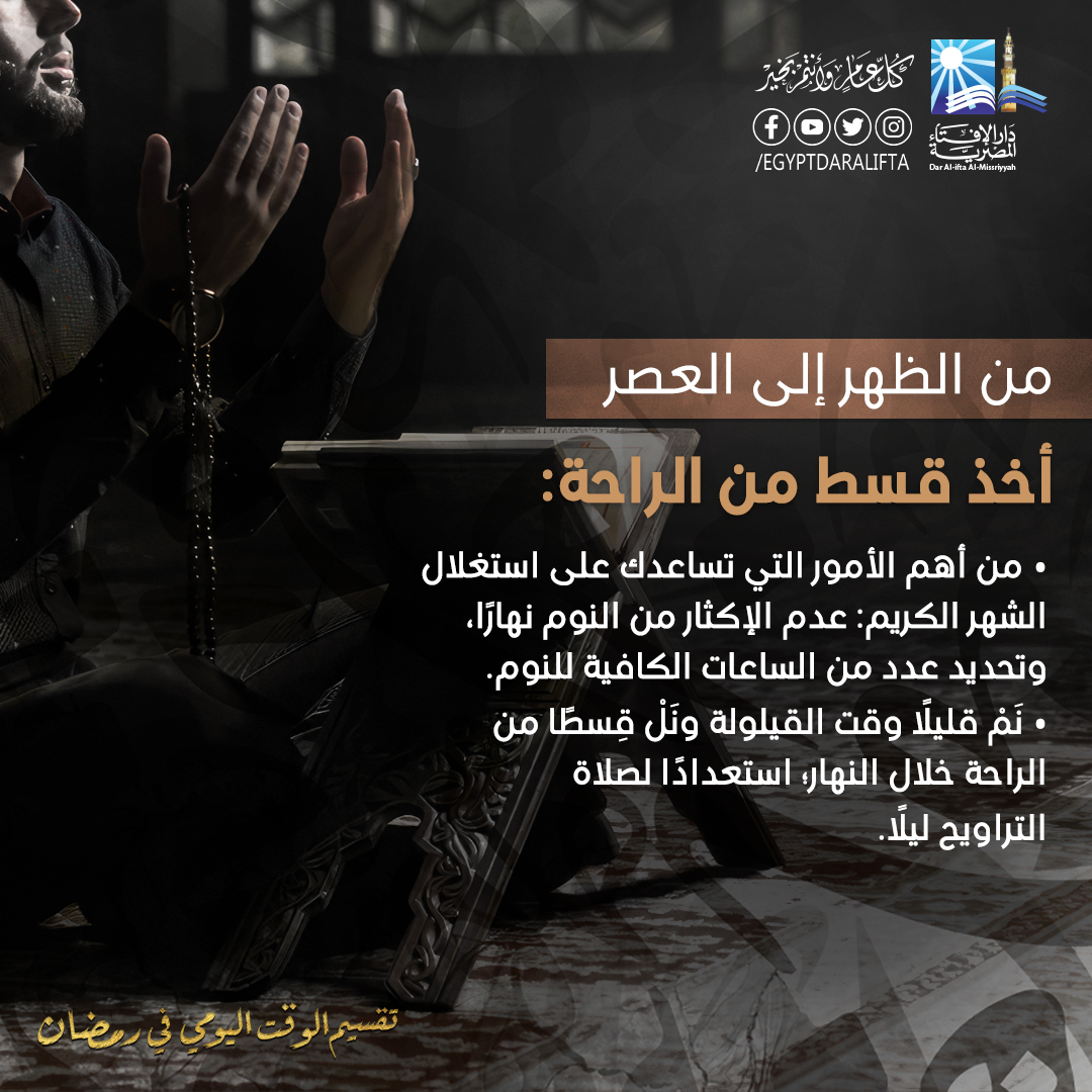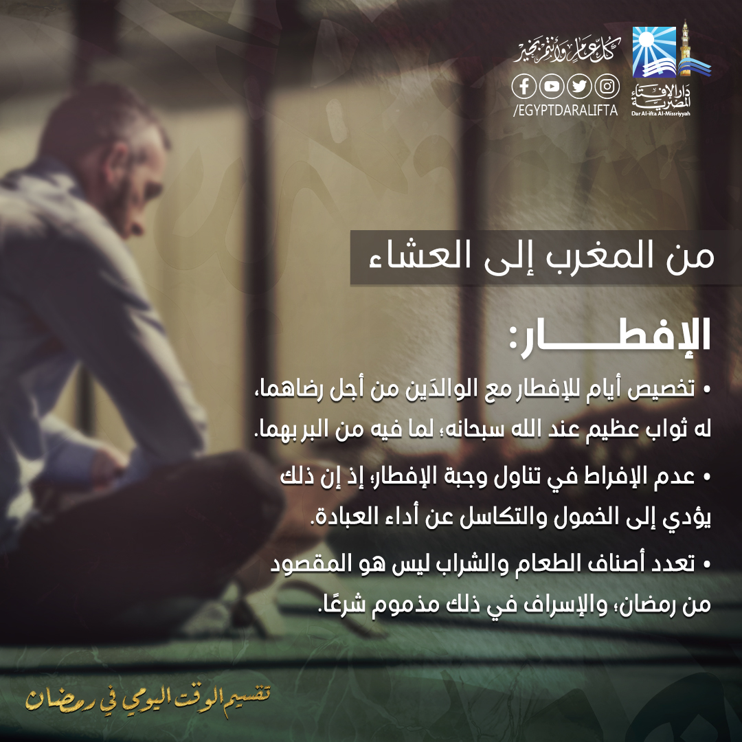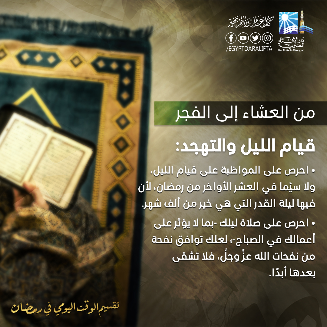 أوضحت دار الإفتاء المصرية أعظم ما يستقبل به شهر رمضان؟ وذلك من خلال تقسيم الوقيت اليومي في رمضان، فقد بدأ الشهر الكريم اليوم الخميس الموافق 23 مارس 2023 للعام الهجري 1444، وللك ندعوكم لاستغلال هذه الأوقات العظيمة كالتالي: