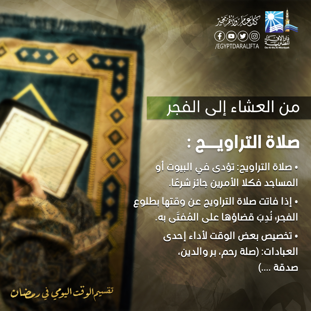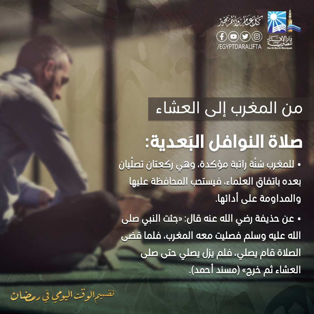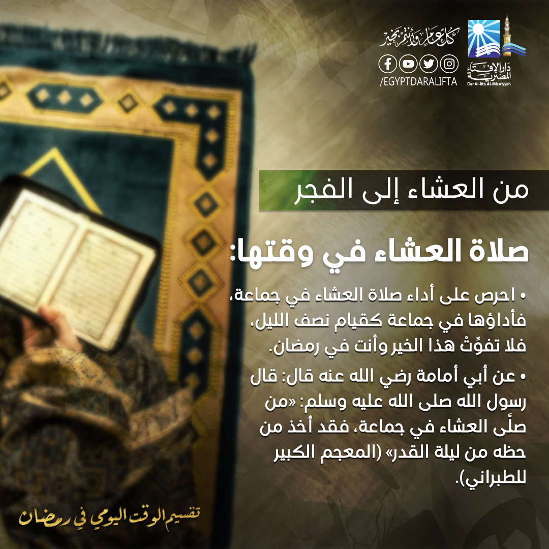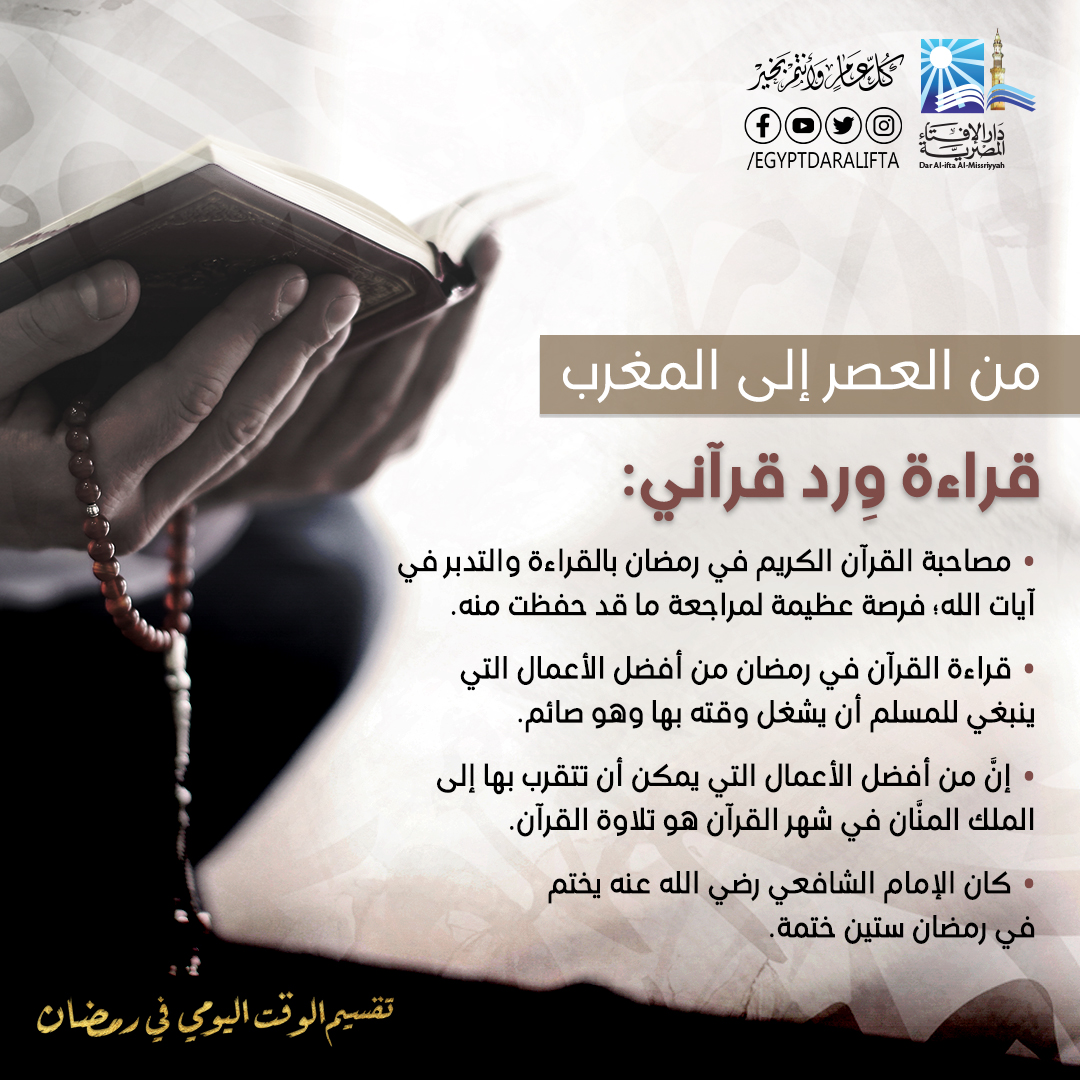أوضحت دار الإفتاء المصرية أعظم ما يستقبل به شهر رمضان؟ وذلك من خلال تقسيم الوقيت اليومي في رمضان، فقد بدأ الشهر الكريم اليوم الخميس الموافق 23 مارس 2023 للعام الهجري 1444، وللك ندعوكم لاستغلال هذه الأوقات العظيمة كالتالي: