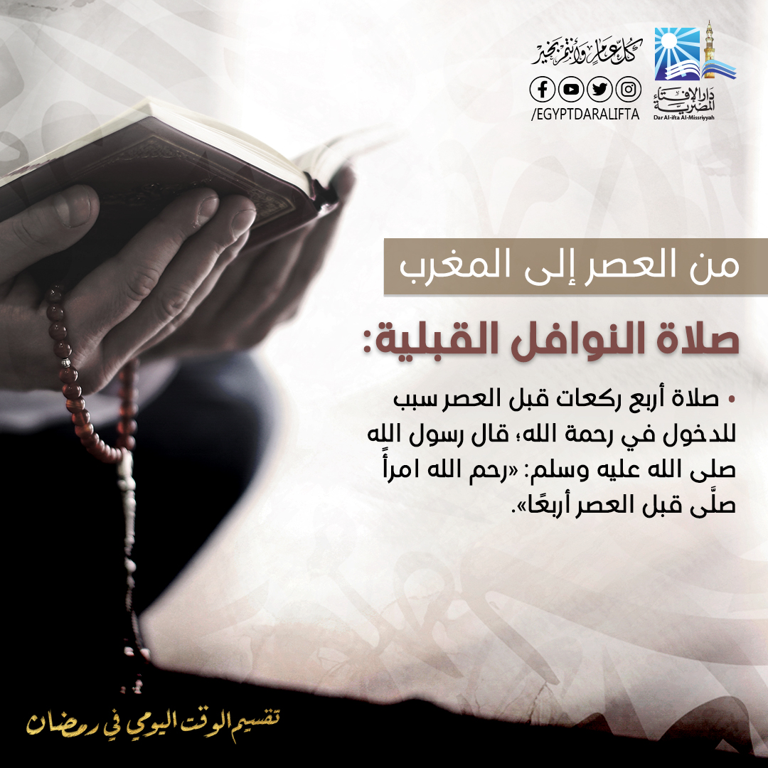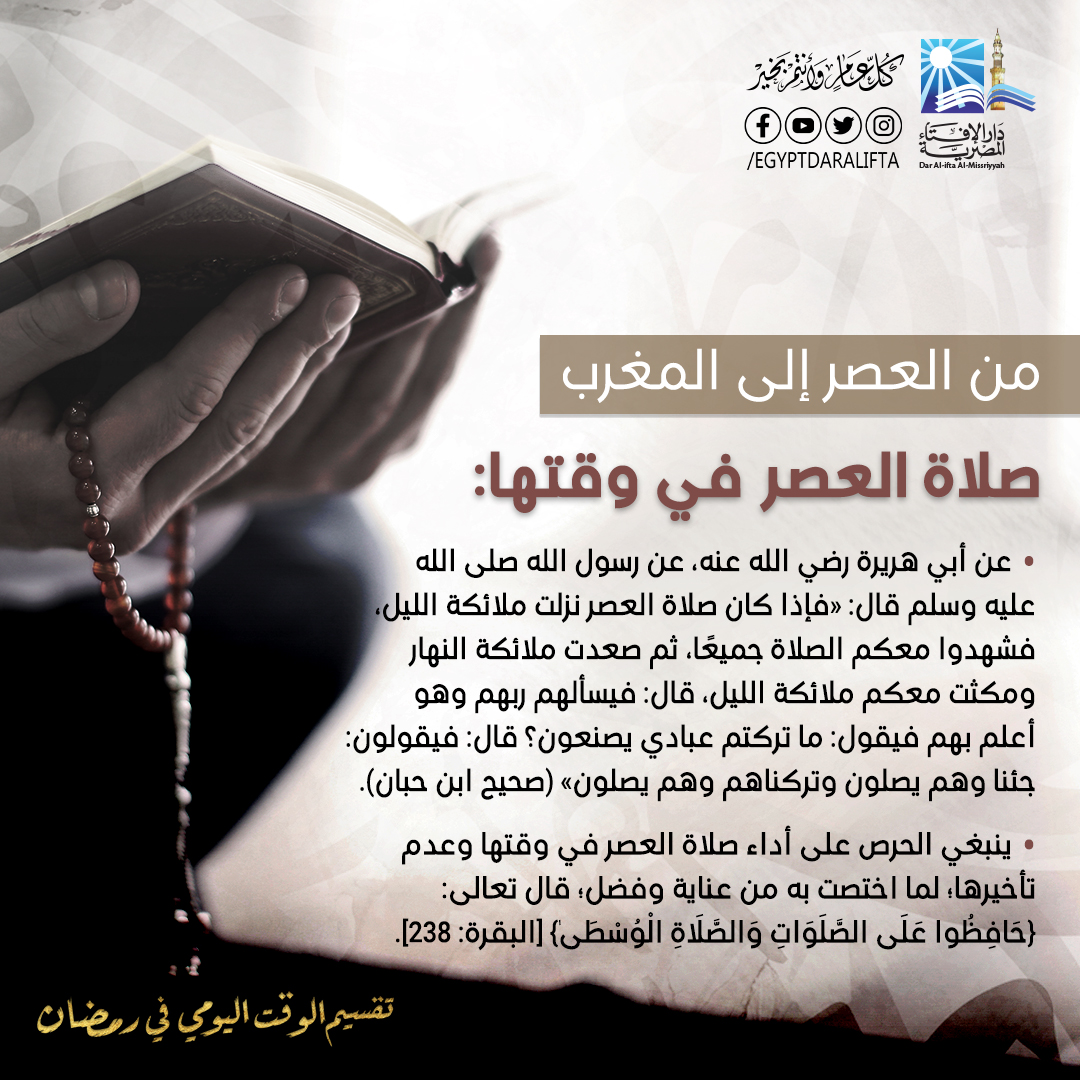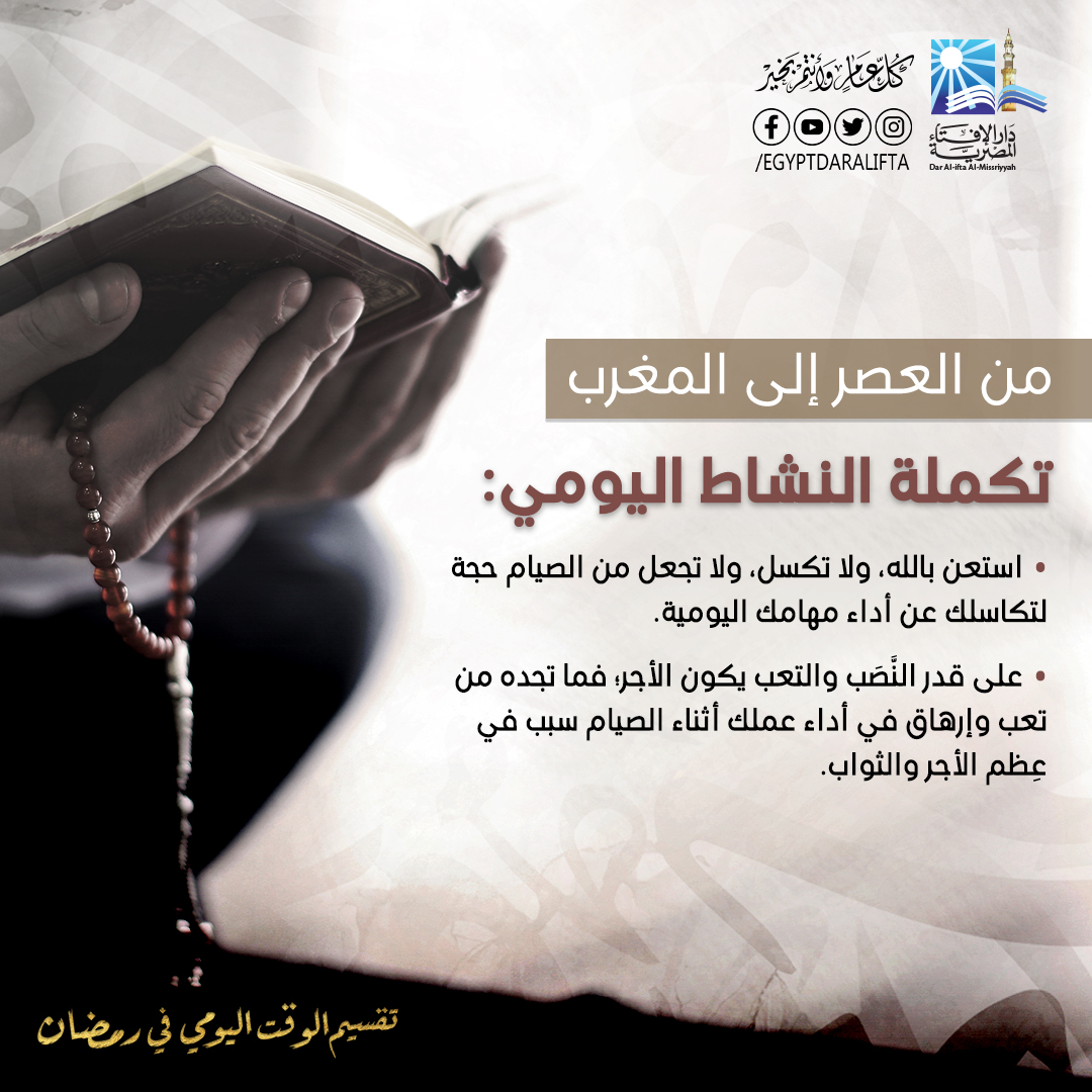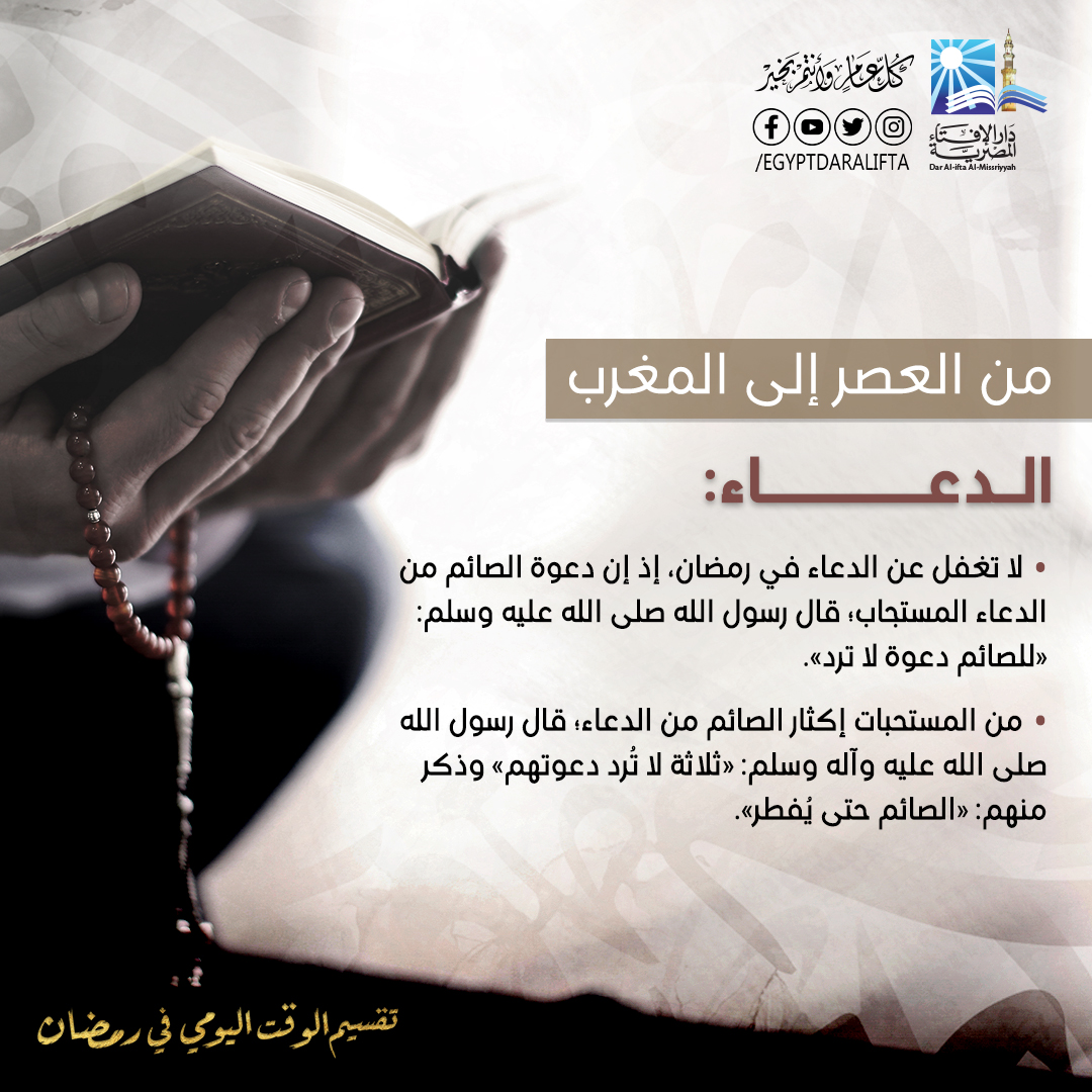 من العصر إلى المغرب هو التوقيت الذي ينتظره جميع الصائمين لترديد الدعاء المستجاب، ونقدم لكم العبادات المستحبة في ذلك التوقيت كالتالي: