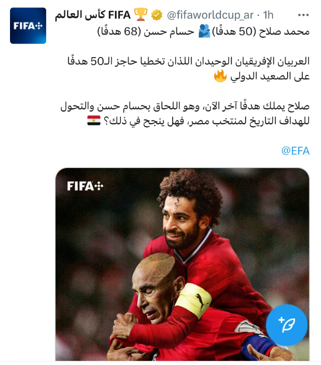 ونشرت الصفحة الرسمية للاتحاد الدولي "الفيفا" على موقع "تويتر": "محمد صلاح (50 هدفًا) حسام حسن (68 هدفًا).. العربيان الأفريقيان الوحيدان اللذان تخطيا حاجز الـ50 هدفًا على الصعيد الدولي.. صلاح يملك هدفًا آخر الآن، وهو اللحاق بحسام حسن والتحول للهداف التاريخي لمنتخب مصر، فهل ينجح في ذلك؟".