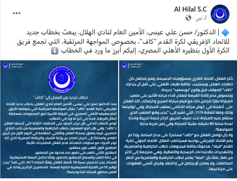 أوضح الخطاب أنه في ظل غياب الردود على الخطابات الثلاثة التي أرسلها الهلال لـ "كاف"، وفي ظل الجو المشحون بخطاب الكراهية والعنصرية من جانب النادي المصري، فيما يتعلق بمباراة الأهلي والهلال، المقامة اليوم الأول من أبريل القادم، استنادًا إلى البيان الصادر عن وزارة الشباب والرياضة المصرية الذي أكد توتر الأجواء مع محاولات التهدئة، قدم الهلال المقترحات الآتية: