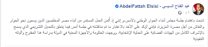 وكتب الرئيس السيسي، عبر صفحته الرسمية على موقع التواصل الاجتماعي "فيسبوك": "تابعت باهتمام جلسة مجلس أمناء الحوار الوطني أمس، وإنني إذ أُثمن العمل المستمر من أبناء مصر المخلصين الذين يسعون نحو الحوار والنقاش من أجل مصرنا العزيزة".