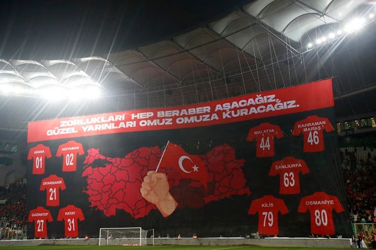 وأرفقت الجماهير في اللافتات قمصان تحمل أسماء المدن التي تضررت من آثار الزلزال.