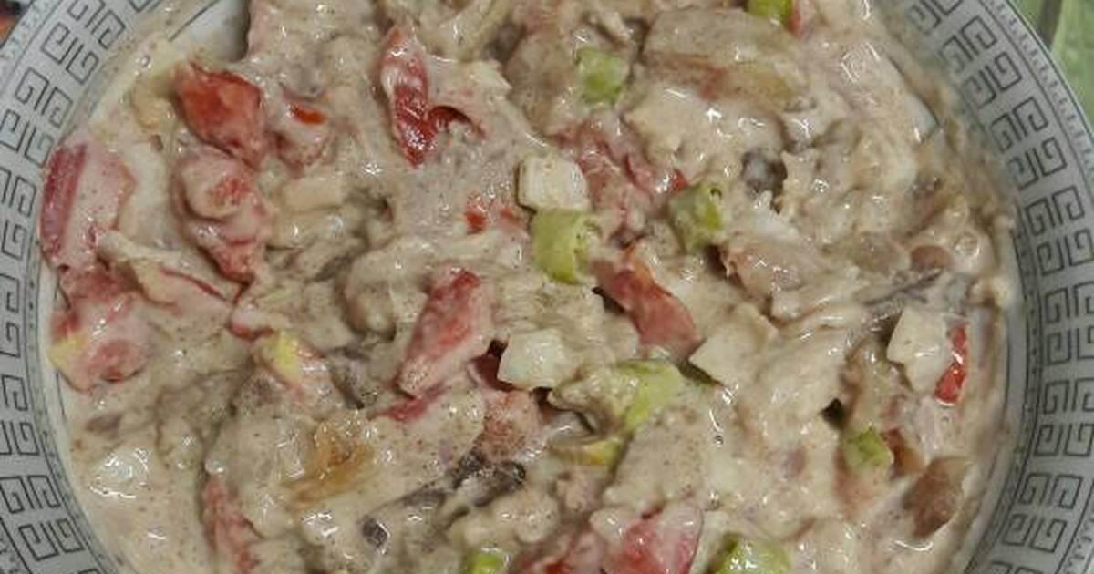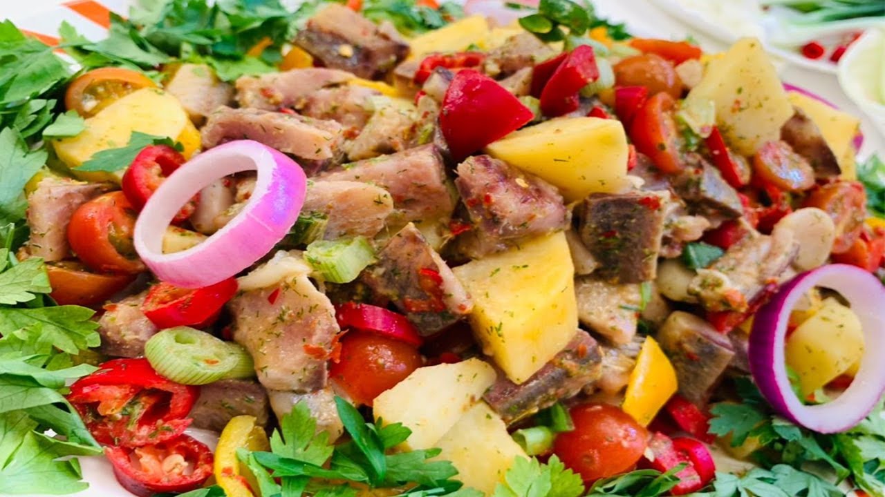 - توضع قطع الرنجة في طبق ويضاف لها مكعبات الطماطم والفلفل والبصل وتقلب مع الخضروات.