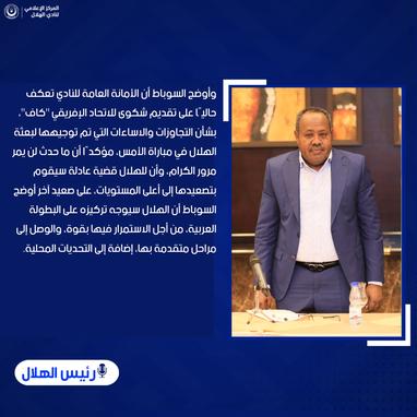 أعلن هشام السوباط رئيس نادي الهلال السوداني، عن نية ناديه بتقديم شكوى رسمية ضد النادي الأهلي المصري، أمام الاتحاد الإفريقي لكرة القدم "كاف" على خلفية أحداث المباراة الأخيرة بين الفريقين في ختام دور المجموعات لمسابقة دوري أبطال إفريقيا.