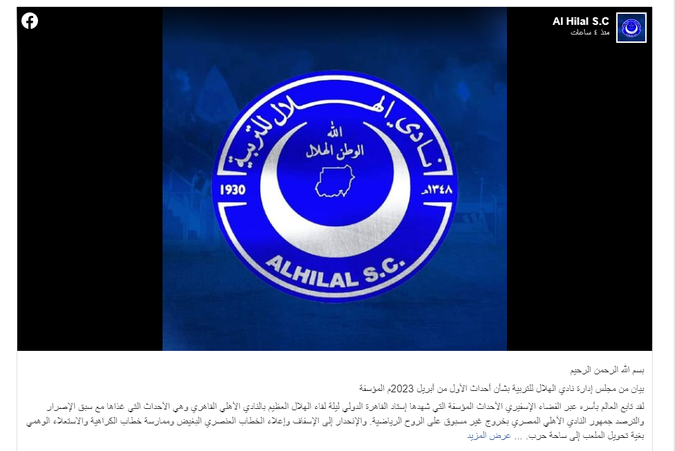 وذكر الهلال في بيان رسمي، الإثنين: "تابع العالم بأسره الأحداث المؤسفة التي شهدها استاد القاهرة الدولي ليلة لقاء الهلال بالأهلي وهي الأحداث التي غذّاها مع سبق الإصرار والترصد جمهور الأهلي بخروج غير مسبوق على الروح الرياضية والانحدار إلى الإسفاف وإعلاء الخطاب العنصري البغيض وممارسة خطاب الكراهية والاستعلاء الوهمي".