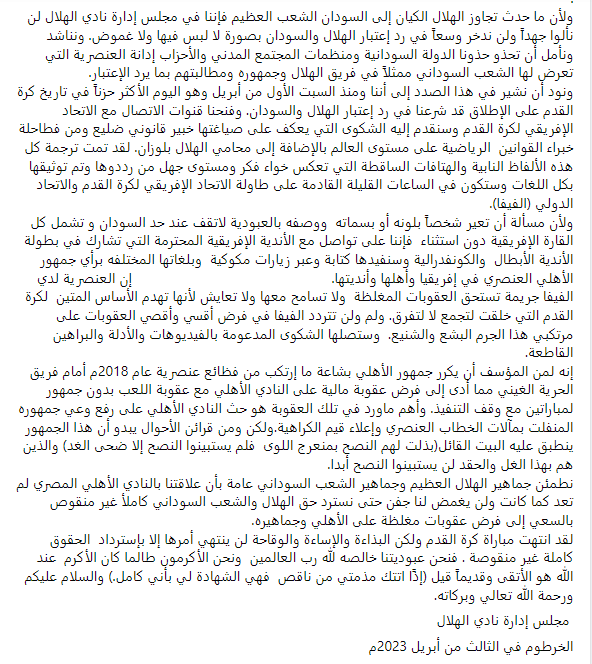 كما أوضح بيان الهلال أنه سيتم مراسلة جميع الأندية الإفريقية كتابة برأي جمهور الأهلي "العنصري" في إفريقيا وأهلها على حد وصف البيان.