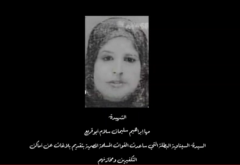 حيث شهدت الحلقة 12 من مسلسل الكتيبة 101 استشهاد السيدة السيناوية مها إبراهيم سليمان، والتي تجسد دورها الفنانة وفاء عامر، إذ ظهر خلال مشهد النهاية جلوسها ومن خلفها التكفيريين وهم ينفذوا مشهد قتلها رميًا بالرصاص بسبب تعاونها مع الجيش والأجهزة الأمنية بصورة كبيرة.