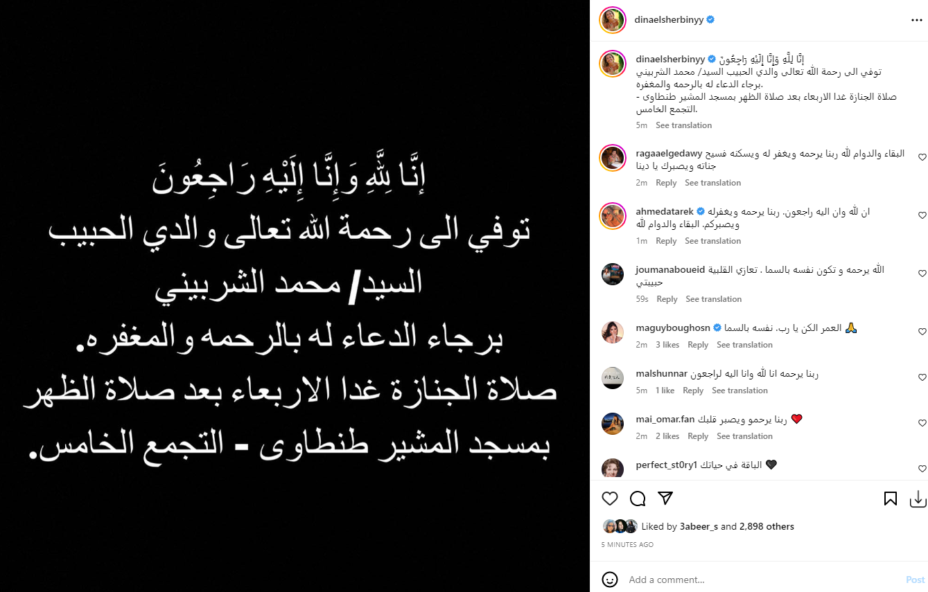 وكتبت دينا الشربيني عبر حسابها على انستجرام، قائلة: إنا لله وإنا إليه راجعون.. توفي إلى رحمة الله تعالى والدي الحبيب السيد محمد الشربيني برجاء الدعاء له بالرحمة والمغفرة.. صلاة الجنازة اليوم الأربعاء بعد صلاة الظهر بمسجد المشير طنطاوي بالتجمع الخامس.