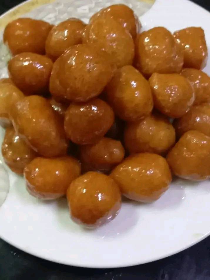 - لتكون كرة تقطع بالملعقة، ونضعها بالزيت مع التقليب حتى تاخذ لونا ذهبيا، ثم نغمسها في الشربات أو نرش فوقها سكر بودرة وتقدم بالهناء والشفاء.
