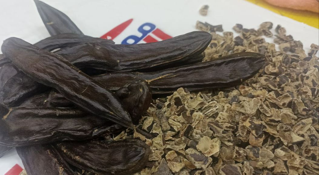 - نضيف الخروب المجروش مع كربونات الصوديوم ونقلب المكونات مع بعضها البعض عدة دقائق حتى تتداخل وتتجانس.