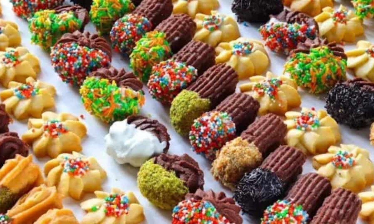 - يشكل البيتي فور بالماكينة أو القمع المخصص له وترص حبات البيتي فور في صاج مغلف بورق زبدة.