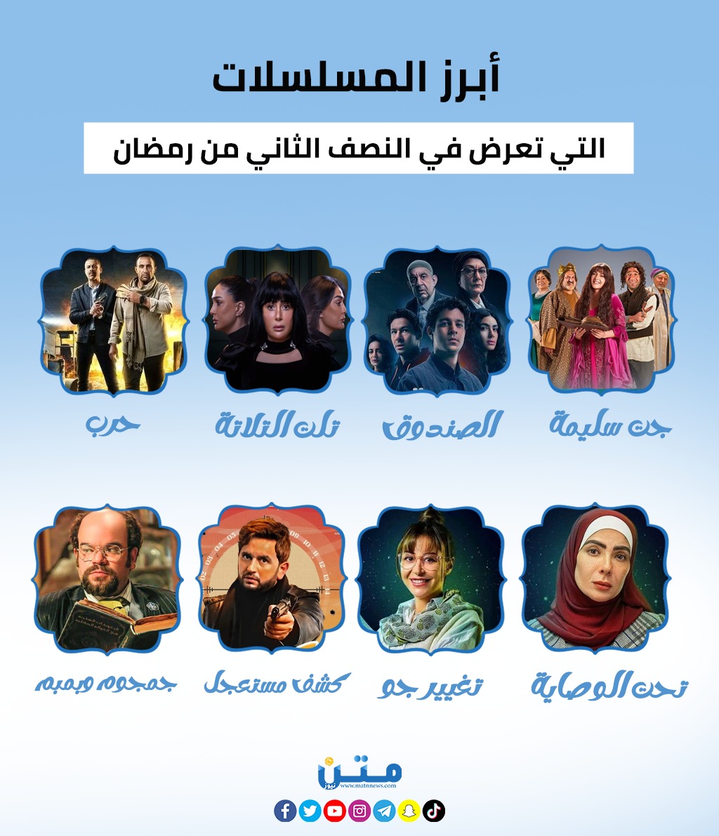 أبرز المسلسلات التي تعرض في النصف الثاني من رمضان (إنفوجراف) مسلسلات السبت 08/أبريل/2023 - 07:27 م 4/8/2023 7:27:20 PM انفوجراف متن محمد حسن شارك طباعة جت سليمة الصندوق تلت التلاتة حربتحت الوصايةتغيير جوكشف مستعجلجمجوم وبمبم شارك تحت الوصاية مسلسلات إنفوجراف جت سليمة مسلسل رمضان