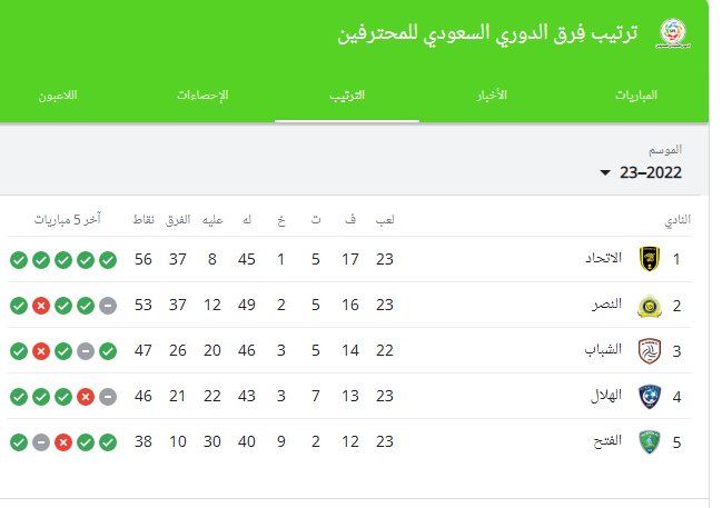 ويتصدر اتحاد جدة جدول ترتيب الدوري السعودي برصيد 56 نقطة، بينما يحتل النصر الوصافة برصيد 53 نقطة، فيما يحتل الشباب المركز الثالث برصيد 47 نقطة.