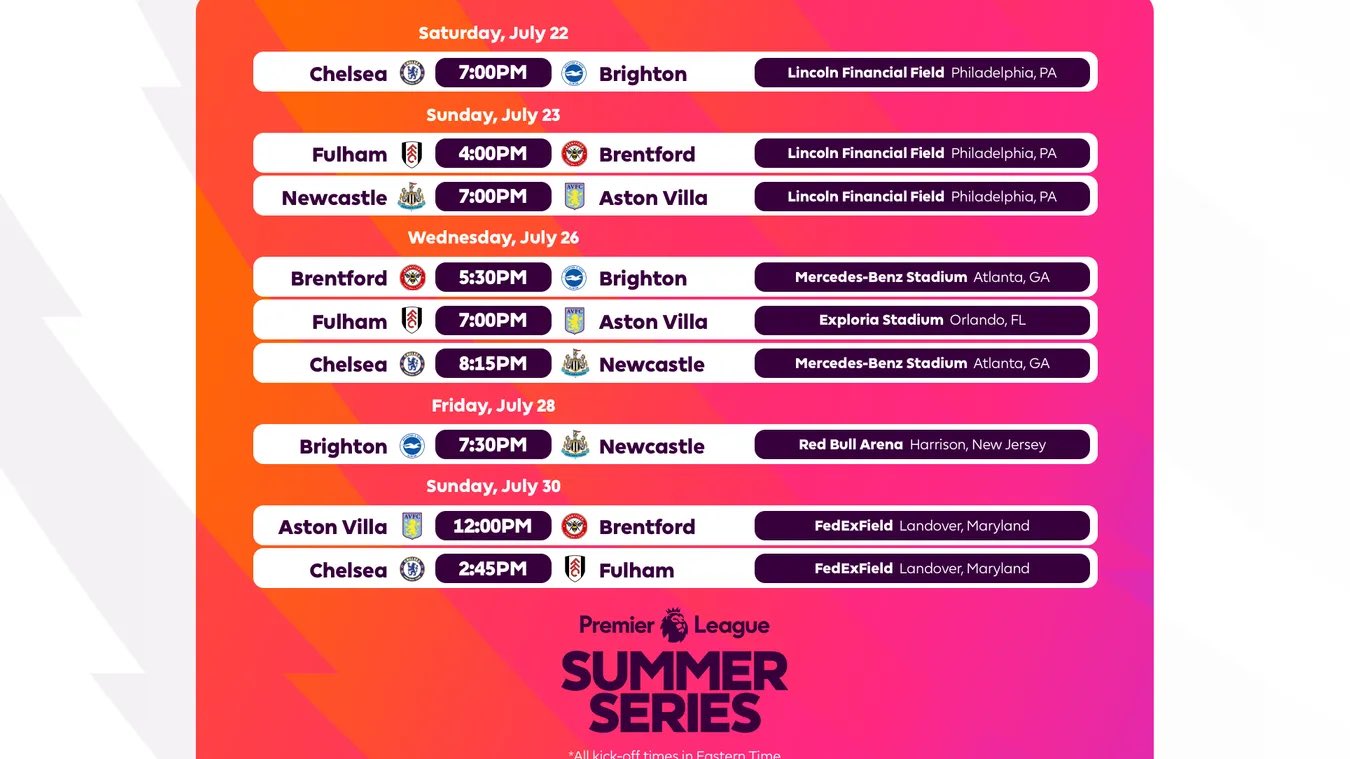 ومن المقرر أن تقام المباريات الخاصة بالدورة التحضيرية لأندية البريميرليج خلال الفترة من 22 إلى 30 يوليو المقبل، في خمس مدن أمريكية، هي: أتلانتا، نيو جيرسي، أورلاندو، فيلادلفيا، واشنطن.