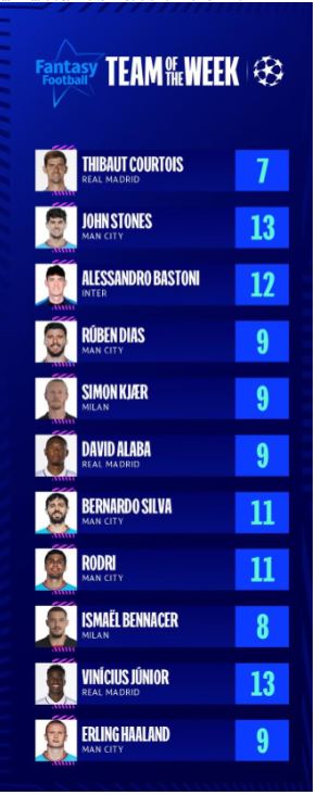 خط الدفاع: جون ستونز "مانشستر سيتي الإنجليزي"، أليساندرو باستوني "إنتر ميلان الإيطالي"، روبن دياز "مانشستر سيتي الإنجليزي"، سيمون كيير "ميلان الإيطالي"، ديفيد ألابا "ريال مدريد الإسباني".