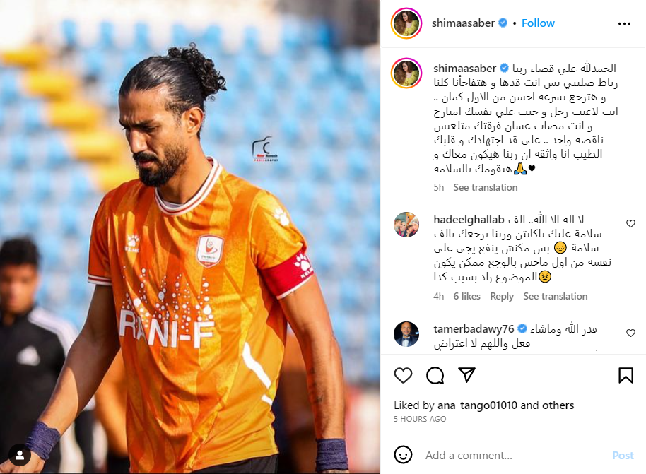 وكتبت شيما عبر صفحتها الشخصية على موقع التواصل الاجتماعي "إنستجرام": "الحمد لله على قضاء ربنا، رباط صليبي بس أنت قدها وهتفاجأنا كلنا وهترجع بسرعة أحسن من الأول كمان.. أنت لاعب رجل وجيت على نفسك امبارح وأنت مصاب عشان فرقتك متلعبش ناقصة واحد.. على قد اجتهادك وقلبك الطيب أنا واثقة إن ربنا هيكون معاك وهيقومك بالسلامة".