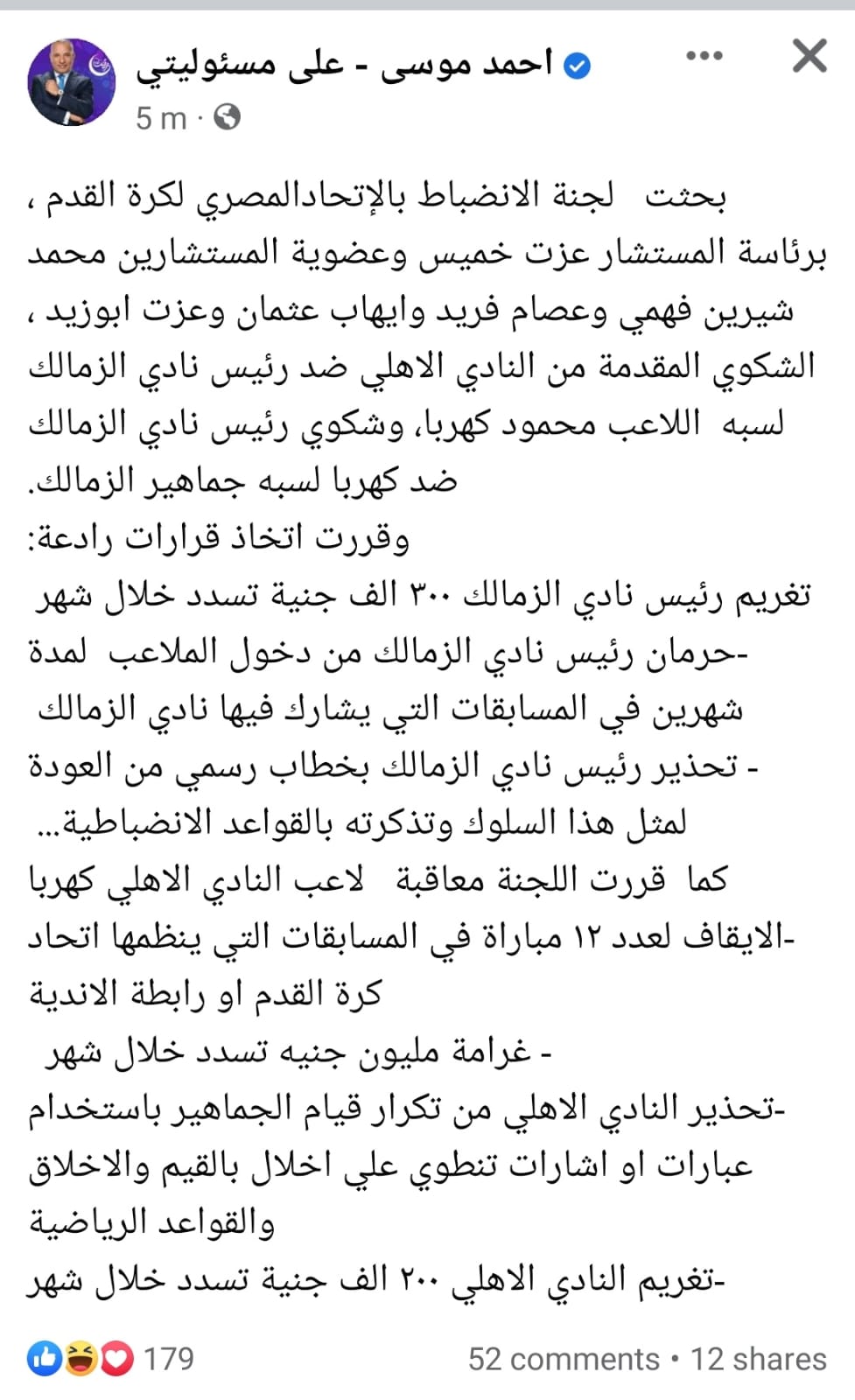 ونشر أحمد موسى عبر صفحته الرسمية على موقع التواصل "فيسبوك": بحثت لجنة الانضباط بالإتحاد المصري لكرة القدم، برئاسة المستشار عزت خميس وعضوية المستشارين محمد شيرين فهمي وعصام فريد وايهاب عثمان وعزت ابوزيد، الشكوى المقدمة من النادي الاهلي ضد رئيس نادي الزمالك لسبه اللاعب محمود كهربا، وشكوي رئيس نادي الزمالك ضد كهربا لسبه جماهير الزمالك".