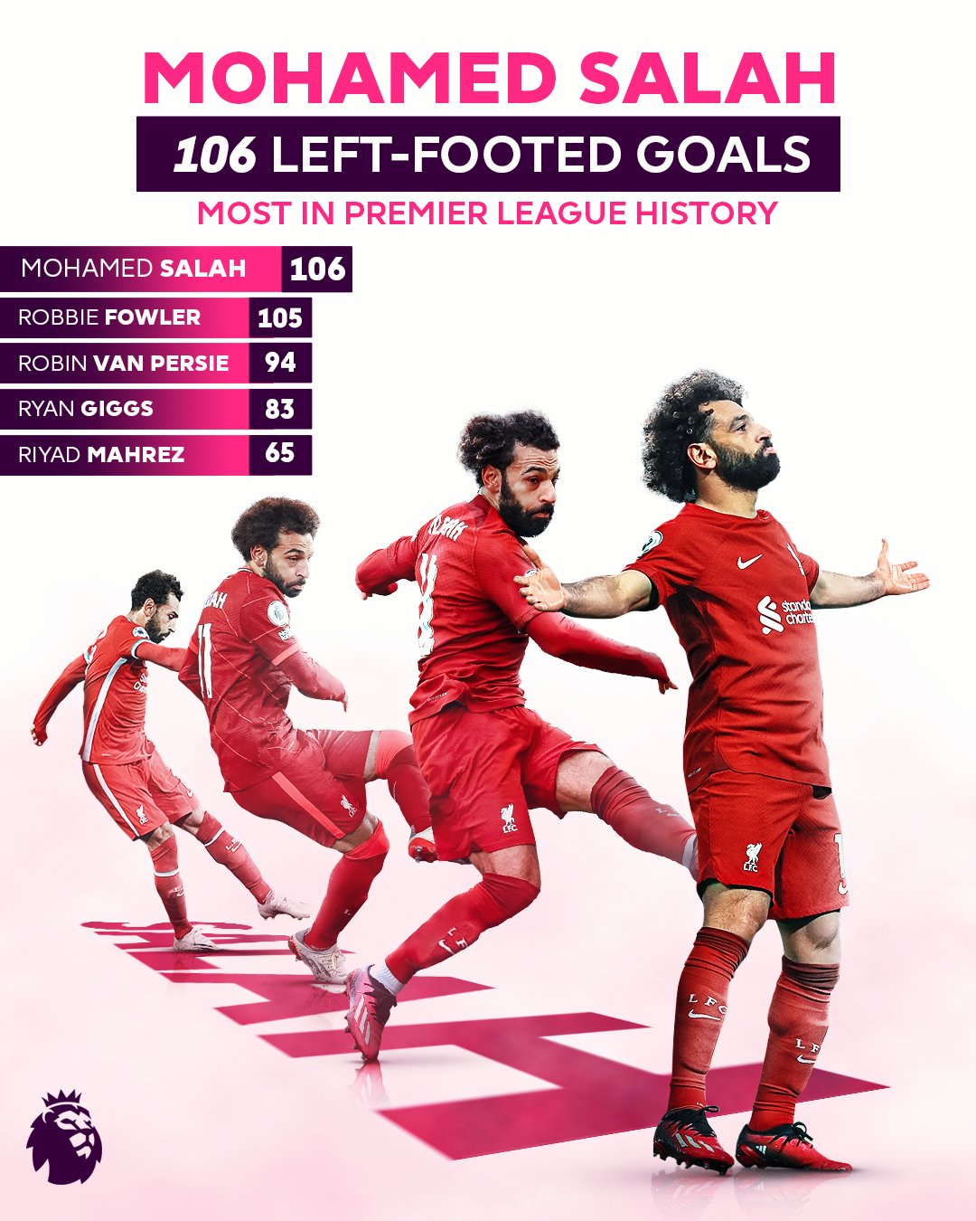 وتخطى صلاح بهذا العدد أسطورة ليفربول السابق روبي فاولر، صاحب الـ105 أهداف، بقدمه اليسرى في تاريخ مسابقة الدوري الإنجليزي الممتاز.