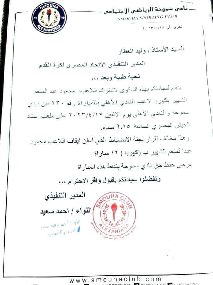 أعلن نادي سموحة السكندري تقدمه بشكوى رسمية إلى الاتحاد المصري لكرة القدم، بسبب مشاركة محمود عبد المنعم كهربا مع النادي الأهلي مساء أمس، الإثنين رغم إيقافه.