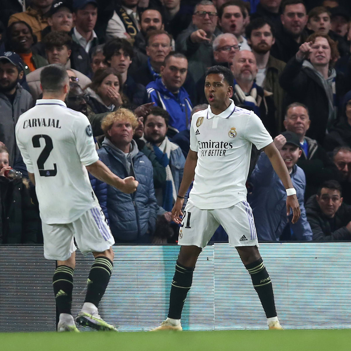 سجل هدفي ريال مدريد في مباراة تشيلسي، المهاجم البرازيلي رودريجو في الدقيقتين 58 و80.