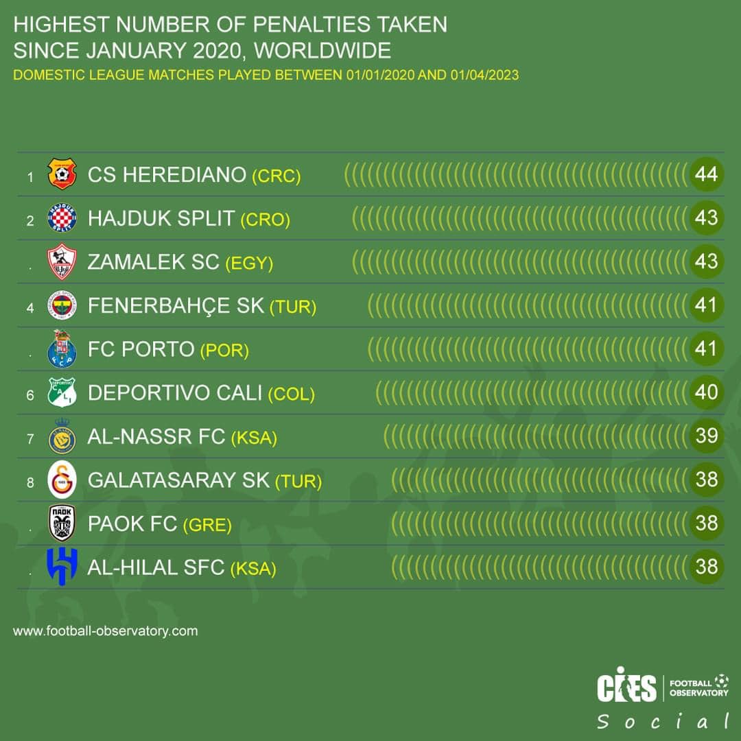 كشف المركز الدولي للدراسات الرياضية «CIES Football»، عن قائمة أكثر 10 أندية حصولًا على ركلات الجزاء بداية من يناير عام 2020 وحتى الآن.