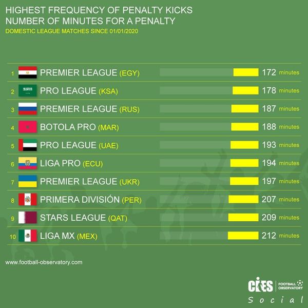 وجاء الدوري السعودي في المركز الثاني بمعدل ضربة جزاء كل 178 دقيقة، واحتل الدوري الروسي المركز الثالث بـ187 دقيقة.
